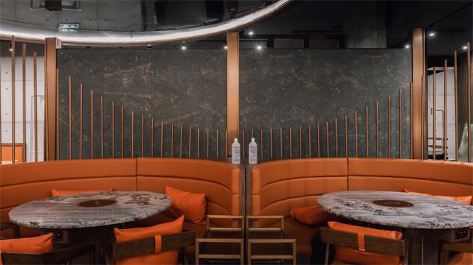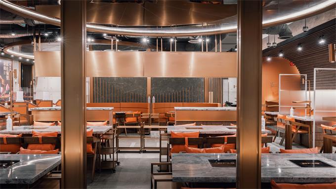 靓丽的玫瑰金色不锈钢门窗和屏风隔断,与透明的玻璃结合,让整个餐厅视野开阔,增强了环境的视觉感受。在装修主材多投入,是为了减少耗材投资,做有轻有重,主次分明。