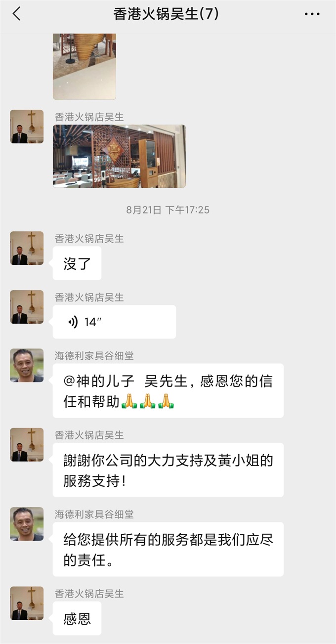 在和喜亭轩火锅项目负责吴先生合作的过程,公司和吴先生都会站在对方的立场上做事情,双方都很配合。这个订单生产的很顺利。我们的产品到达客户餐厅后得到客户的认可。在和吴先生的沟通中得知他是香港装修从业员工会副秘书长,会帮助我们宣传产品。